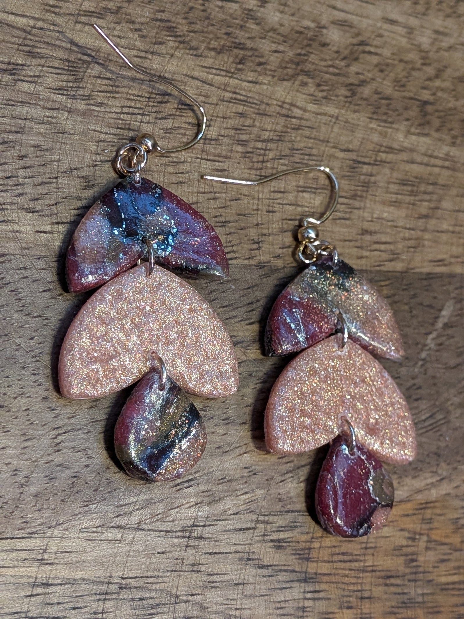Striking three-part earrings that dance with color and movement. Each dangle features a marbled burgundy and pale coppery-pink palette, with a hammered center section that catches the light beautifully. The layered design creates dimension and visual interest, making these statement pieces perfect for adding personality to any outfit. Lightweight and comfortable for all-day wear.